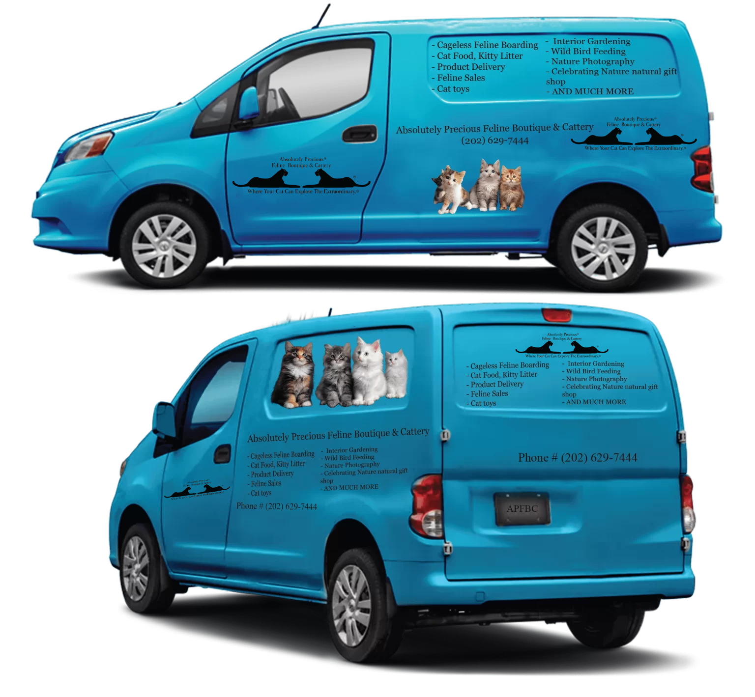 Customized Delivery Vans is the best employee we have. They represent the company & all we do. With the use of C.D.L., Drivers bonded and secured, equipped with flyers & promotional items, are like moving billboards through the neighborhood. Custom Vans are equipped for pickup & delivery of Cats, Cat Food & Kitty Litter, & all related cat accessories with a $49.00 minimum & a 10 square-mile delivery area (exceptions can be made). The delivery vans should always be in pristine condition mechanically/cosmetically as they represent the company and should be maintained by staff and drivers.